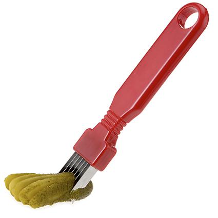 Cortador en tiras para pepinos u otras verduras. Sus siete hojas cortan rápida y eficientemente. Los pepinillos en vinagre pueden convertirse rápidamente en un abanico decorativo. Dimensíon: 163 x 29 x 17 mm Material: ABS, INOX